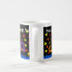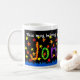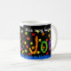 Ett stort vitt mugg med ord, "Detta mugg tillhör till" med vit text, följt av "Jon" i handmålat pappert kollage, med en skarpsill av rött, orange och gult stjärnor, på svart bakgrund. Mikrovåg och diskmaskin säker.