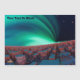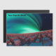 En aurora, grönt på grund av joniserat syre, verkar vara låg vid horisonten, en stad ligger i förgrunden. Lägg till din egen text.