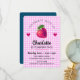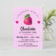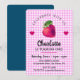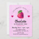 SÖT BARN Flicka FÖDELSEDAGS INVITATION MED JORDGUBB OCH HJÄRTAN PÅ ROSA RUTIG BAKGRUND OCH MÖRKBLÅ GRÖN BAKSIDA.