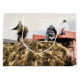 En konstgjord utformning av jordbrukare som är upptagna med att tröska havre på en vintage som tröjer maskin.