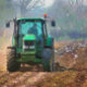 Förberedelser inför nästa skörd. Traktorns häckar (pilar) fält och vild fåglar söker efter mat i den nytillvända jorden. Watercolor England.