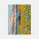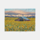 Fotot från fantastisk Getty Bilder har en fält av solblommor som växer runt en gammal utsliten lada med snöberg i bakgrunden.
