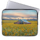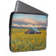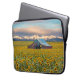 Fotot från fantastisk Getty Bilder har en fält av solblommor som växer runt en gammal utsliten lada med snöberg i bakgrunden.