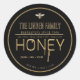 Svart etikett med guld och gräns. HONEY trycks i en "präglad" metallisk guld-gradient med honungsdroppar. Din servergrupp eller bigård namn skrivs ut med ett öppet teckensnitt. Redigerbar text nedanför bigården namn för plats eller honungssort. "rent rå-lokal" kan ändras till plats och kontaktinformation på en eller två rader. Kontakta säljaren om du vill ha hjälp med formatering. Biodling i lycklig!