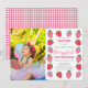 Söta jordgubbsflickans foto "Berry First Födelsedagsfest" som visar ett ram av jordgubbar och ett tillbaka kontrollerat mönster vid rosa av bär. Sammansatt design efter Helgdag Hearts-design.