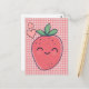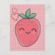 En rolig jordgubbsbäck med det vackraste leendet, ett rött ansikte och grönt lämnar ovanpå med rosa kärlek hjärtan ovan.