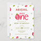 Jordgubbsberry: Bjud i första födelsedag till flicka, söt. Jordgubbar, löv och vita blommigtar. Berry 1:a födelsedag inbjudan.