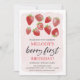 Den här söta jordgubbs 1-års inbjudan har original handmålade jordgubbar på en ljus rosa bakgrund.