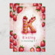 Fira en speciell födelsedag med den här vackra inbjudan till jordgubbstårtan brev "K"-tårtan! Den här charmerande vattenfärgen har en roligt och en fin kaka som är formad som "K" i brev dekorerad med färska jordgubbar, rosa isbildning och ett glödande födelsedagsljus. Den mjuka bakgrunden till rosan med spridda jordgubbar ger en lekfull beröring. Anpassa med ditt barns namn, ålder och party för ett jordgubbsfirande med ett enda slag. Perfekt för barn som frukttemade party eller sommarfödelsedagar i kärlek!