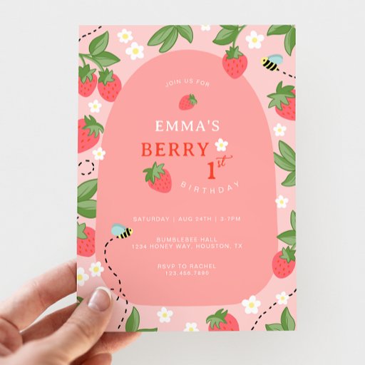 Skicka en söt hälsning med tacksamhet med detta Berry Sweet jordgubbskort! Designat med handritade jordgubbar och en surrande bin är detta personliga tackkort det perfekta sättet att tacka gästerna för att de firade din lilla enas speciella dag.