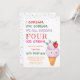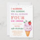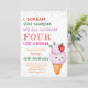 Fira ditt barns fjärde födelsedag med en söt och trendig glass-inbjudan! Inbjudan innehåller en förtjusande tecknad av en glasskon med jordgubbsbär på ovansidan, tillsammans med den klyftiga frasen "Jag skriker, du skriker, vi skriker alla efter glass!" Insidan av inbjudan ger tillräckligt med utrymme för viktiga detaljer som datum, tid, plats och OSA.