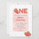 Jordgubbsinbjudan till födelsedagsfest. Ljus bokstavsstil med jordgubbar. Söta prickar på baksidan. Rött och rosa. Perfekt för bebis eller småbarns första födelsedag, Lätt att redigera modern rolig text. Passar bra till Tutti Frutti / Twotii Frutti-fest eller Berry Sweet-tema. Hitta matchande tillbehör i Gemma Harlow Creations-butiken eller överför designen till dina favoritprodukter.