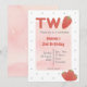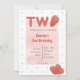 Jordgubbsinbjudan till födelsedagsfest. Ljus bokstavsstil med jordgubbar. Söta prickdetalj på baksidan. Röd och rosa. Perfekt för bebis eller småbarns andra 2:a 2 födelsedag, Lätt att redigera modern rolig text. Passar bra med Tutti Fruity / Twotii Fruity festtema eller bärigt sött tema. Hitta matchande tillbehör i Gemma Harlow Creations-butiken eller överför design till dina favoritprodukter.