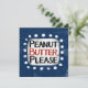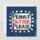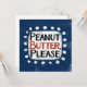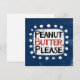 "Jordnöt, tack" är en söt textdesign i blått med svart och röd text, tillsammans med en vit accentform och vita texturerade vita punkter som omger den.