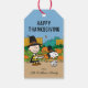 Lägg till den här roligten Peanuts-Thanksgiving-förmånstaggen till ett kontrakt på helgdag bord.