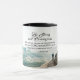 En person som går på ett väg och som bortser från en vacker bergsdal är inspirerad av kaffet mugg. Bible Verse Joshua 1:9, "Var stark och modig. Var inte rädd. Var inte nedstämd, för Gud kommer att vara med dig var du än går." *