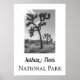 Bilden visar ett svart och vitt foto av ett ökenlandskap med två framstående Joshua träd. Träd står högt mot ett muterat himmel, vars grenar når ut i olika riktningar. Förgrundsinformationen är fylld med låg ökenvegetation som skapar djup och struktur.