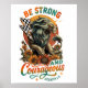 Fredlig, färglös design med ett fall/höstscen med stora lejona och fallblommor. Den färgstarka inspirerande texten lyder: "Var stark och modig. Joshua 1:9". Den här utformningen är tillgänglig för en mängd olika produkter.