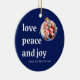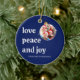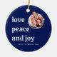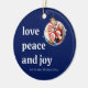 Julfamiljen Photo Kärlek Peace Joy Helgdag Ornament. Denna minimalistiska utformning har ett klassiskt budskap "Kärlek, fred och glädje", ett hjärtligt önskemål, modern och elegant typografi på elegantens midnattblå bakgrund. Den här prydnaden är en perfekt för alla som vill ha helgdag med personlig med glatt beröring. Den är parad med ett lekfullt julfoto ram. Fullt anpassade med ditt foto och namn. Idealisk för att sprida julglädje med contemporary och tidlös elegans. Behöver du hjälp med anpassning? Kontakta remidevandesigns@gmail.com RemideVan©
