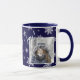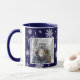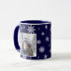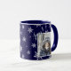 Detta vackra och roligt kaffe mugg är ett underbart sätt att fira säsongen. Har en roligt med vitt snöflingor på en marin blå bakgrund med fotot uppladdat till ett fyrkantigt ram. Bildtexten lyder: Joy! En enkel festlig utformning är perfekt till jul eller till vilken vinter som helst tillfälle!