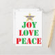 Önska någon glädje, kärlek, och fred i julklapp med den här presenten. Den här produkten visningar en guld-färgad stjärna med texten "WISHING You" i blått teckensnitt. Under stjärnan står ord "JOY" "KÄRLEK" och "PEACE" i växlande grönt och rött brev. Den här designen representerar triangulär form för ett Julgran med en stjärna överst.