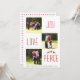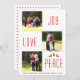 Joy, Kärlek, Peace and red, white mönster jul - enkel fotokollage av tre foto kort. Den innehåller ord "glädje, Kärlek, fred" i rött och grönt och tre familjefotografier. Ett geometriskt mönster i rött och vitt täcker baksidan. Fotografi © Storytree Studios, Stanford, CA