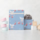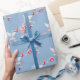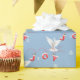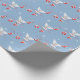 Vit duvflygning med rött JOY-meddelande på en röd och vit strimlad sträng med blå vinterbakgrund i snöflingor.