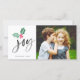 Det här Helgdag-fotokortet är helt enkelt snyggt och gör ett djärvt påstående med sin enkelhet och känsla. Konstruktionen är minimalistisk och konstnärlig med glädje inskriven i penselbokstäver och har exklusivens handmålade vattenfärgsholly och vattenfärgspenseldrag mönster på baksidan. Ge glädje åt nära och kära i år med det här helgdag i snyggten.