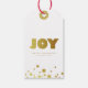 Enkel julklapp och guld-gåva eller flaska-märkre med "Joy"-text i roligt men elegant, typografi stil och mousserande stjärnor. Anpassa med kort hälsning och avsändarens namn.
