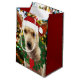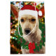 En digital konsmålning av en ung valp redo till jul med en andedräkt, julhatt och ett dekorerat träd.