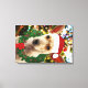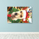 En digital konsmålning av en ung valp redo till jul med en andedräkt, julhatt och ett dekorerat träd.