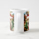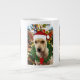 En digital konsmålning av en ung valp redo till jul med en andedräkt, julhatt och ett dekorerat träd.