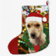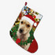 En digital konsmålning av en ung valp redo till jul med en andedräkt, julhatt och ett dekorerat träd.