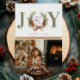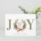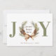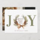 Ett typografiskt fotokort med JOY som huvudrubrik i grönt och en vattenfärgad gräs cone och bågkrans skapar "O" med "fredligt hopp kärlek" i mitten. Anpassa med din signering i grönt och ditt favoritfoto på andra sidan.