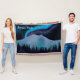 Lila och blått nordligt ljus glor över berg täckta av snö på ett kall i Alaska. "Joyeux Noё l" visas i blått och vitt.