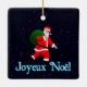 Tror du på tomten? En bild av ett stridande Jultomten som bär en grönt väska av presenter, som läggs ovanpå en stjärnbakgrund. Text som läser "Joyeux Noё l" visas i ljusblå och vit.