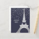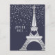 Särdrag för dessa Julhälsningar det franska inspirerade julvykort som ett fauxsilver avbildar av det Eiffel torn, med a och överflöd av vintersnö, allt på en djup midnatt blåttbakgrund.