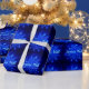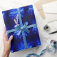 En svärm av blått snöflingor. "Joyeux Noel" visas i blått och vitt.