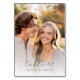 This wedding table card features a warm, romantic photograph of two individuals smiling and leaning towards each other in an outdoor setting with soft, blurred greenery. The design uses a gentle color palette of light beige and pale blue tones, creating a serene and inviting atmosphere. Elegant cursive typography highlights the table number, while a simple serif font emphasizes customization for names. The overall mood is joyful and affectionate, perfect for celebrating love at weddings or formal gatherings.