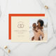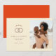 This wedding save the date features a split layout with elegant, modern design elements. The left side showcases interlocking rings adorned with small red hearts on a soft beige background, while the right side includes a joyful beach photograph. The typography combines bold serif and clean sans-serif fonts, creating a sophisticated yet playful look. Perfect for announcing your upcoming nuptials, this design exudes warmth and celebration, setting the tone for a memorable event.