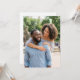 This wedding invitation features a warm and intimate design with two individuals in a close, affectionate pose. The layout is centered around the figures, set against a blurred background of greenery and urban architecture, creating a natural yet sophisticated setting. The color palette includes soft blues and rich browns, complemented by vibrant greens, enhancing the cheerful and loving mood. The photographic style captures realistic details and textures, emphasizing authenticity and connection, making it perfect for celebrating a joyous union.
