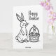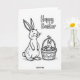 Designed with black line art on a bright white background, the front features a tall rabbit standing on its hind legs with long ears and a closed-eye smile 🐰. Short whiskers and a small spiral detail near its hip add a gentle, decorative touch, as if it’s pausing for a sweet moment. To the right sits a woven basket packed with patterned oval shapes, and a tiny rabbit tucked among them wears a neat bow tie, echoing the bigger rabbit’s cheerful look. A small bird balances on the basket handle, angled toward the pair like it’s watching their friendly exchange. A little heart appears on the basket’s front, hinting at affection in the scene without needing extra words 🌷. Near the top, a casual hand-drawn line of lettering is placed above the illustration in black, spaced to follow the open area of the background. The basket’s weave lines, the bird’s small beak, and the patterned ovals are all outlined in crisp black strokes.