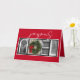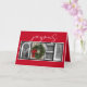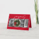 Det här festkortet har en röd bakgrund, vit skripttext som lyder: "joyous" och foton som skapar "noel" i ord. "Noel" från ord består av svarta och vita foton tillsammans med ett foto från färg av en julandedräkt som ger brev "o" i "noel".