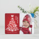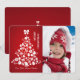 Kända julikoner som snöflingor, klockor, polkagrisar, snögubbar och annat bildar en form i helgdag som är full med en båge mot en strålande röd bakgrund. Ditt favoritfoto fyller i kortet.