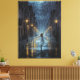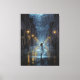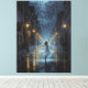 En drömmande digital oljematad nattscen där en flicka med glädje dansar i regnet på en glödande stadsgata, ljus som reflekterar av blötens trottoarer i en dyster, romantisk firande av frihet och kärlek.