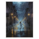 En drömmande digital oljematad nattscen där en flicka med glädje dansar i regnet på en glödande stadsgata, ljus som reflekterar av blötens trottoarer i en dyster, romantisk firande av frihet och kärlek.