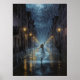 En drömmande digital oljematad nattscen där en flicka med glädje dansar i regnet på en glödande stadsgata, ljus som reflekterar av blötens trottoarer i en dyster, romantisk firande av frihet och kärlek.