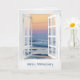 Öppet vitt fönster med genomskinliga gardiner med havsutsikt.
