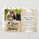 Fira alla årsjubileer med svarta och guldinvitationer med en kalligrafiskrift eller retrotypografisk titeldesign # ÅR UNDER TILLVERKNING som visar hur många år de varit gifta (t.ex. 50 ÅR UNDER TILLVERKNING) och bröllopsåret inom designen och deras foto med en falsk metallisk guld- och vit ombre-bakgrund och konfettikant. Kontakta designern via Zazzle Chat eller makeitaboutyoustore@gmail.com om du vill att denna design ändras, i ett annat färgschema, på en annan produkt eller vill ha koordinerade föremål.