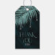 Ta ett slående, glitz och glam-utseende genom att använda biet i denna bröllop-svit som det visas, med juveler som skär av de diamantmärkta löven i handflatan eller ta bort juvel lagrar för ett något mer konservativ utseende. Den här uppsättningen har löv i att skugga pastellteal mot en mörkare, texturerad bakgrund. Den här "Tack"-förmånstaggen för bröllop har en övre gräns av mousserande löv, ett elegant Serif-teckensnitt med briden och triomens initialer och bröllop. Ange enkelt dina uppgifter med hjälp av den angivna mallen. Visa samlingslänken på den här sidan om du vill se alla matchande objekt i den här vackra uppsättningen eller sök-ID830 om du vill se ytterligare alternativ för färg för den här designen.